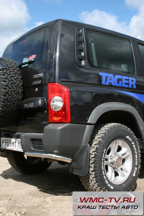 В момент столкновения с встречным автомобилем у тагаз tager отрывает заднее колесо и его выбрасывает в кювет. Сразу отметим что скорость обеих машин была приличной, но при столкновении с авто тагаз tager проявил себя с наилучшей стороны. Высокий клиренс автомобиля сыграл важную роль в безопасности людей, находящихся в авто тагаз tager.