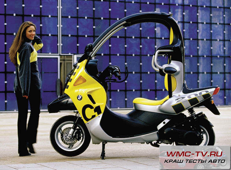 В краш-тесте легкий мотоцикл с кабиной BMW C1 столкнулся с легковым автомобилем на скорости 64 км/час. В результате столкновения кабинный мотоцикл как бы поднырнул под машину, его заднее колесо подскочило вверх, после чего С1 перевернулся на крышу, а затем лег на бок.